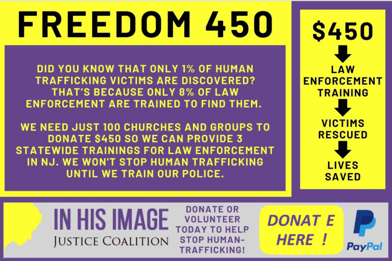 In 2024, IHIJC launched Freedom 450, and initiative to form intentional partnerships with 100 churches. We now have ten church partners, each of whom contribute $450 to help us fund police trainings. Those ten churches paid half of the trainers fee for our last police training. Imagine how many could be trained if another 90 churches joined us! Want to get your church involved? All you have to do is hand your church leadership a packet of info that we will provide, tell them why you think it’s important the church support, and ask them to meet with us. We’ll do the rest! Contact us and let us know you want to help with Freedom 450.